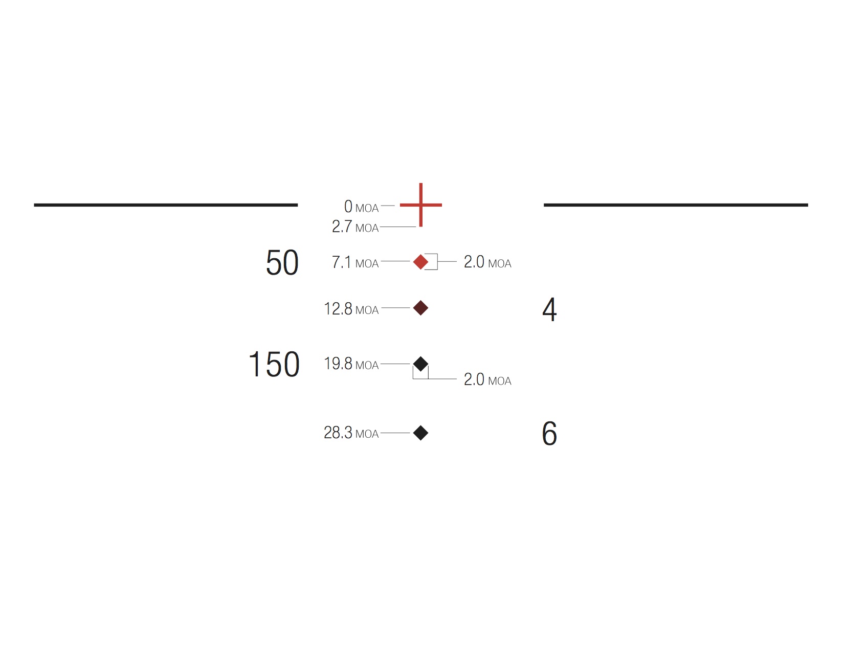 Utilizing standard 16-inch barrel velocities, the 3.5×35 and 4×32 300 blackout models have drops designed to be calibrated with both supersonic (110gr – 125gr) and subsonic (174gr – 240gr) ammunition. Zero the scope with supersonic ammunition at 100 yards using the center of the crosshair. The bottom tip of the crosshair serves as the 200 yard supersonic aiming point. The ballistic drop compensator (BDC) diamonds represent the supersonic hold-overs for 300 yds, 400 yds, 500 yds and 600 yds.