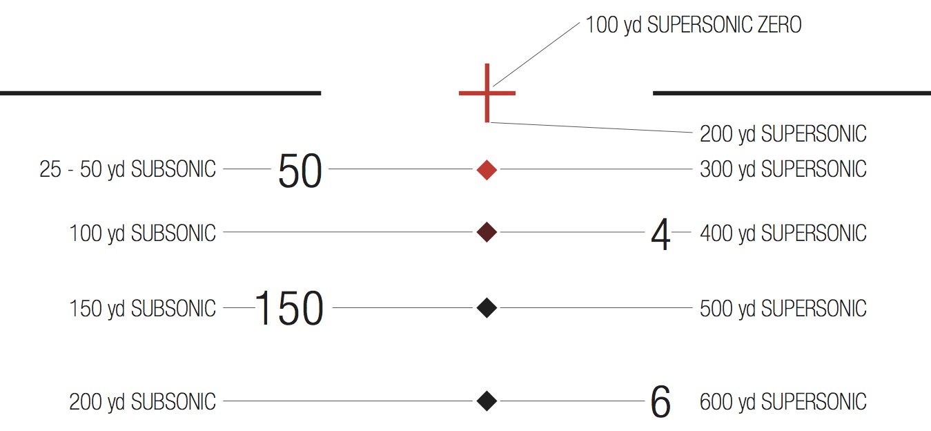For subsonic ammunition, the diamonds serve as the aiming points for targets from 25-50yds, 100yds, 150yds, and 200yds respectively.